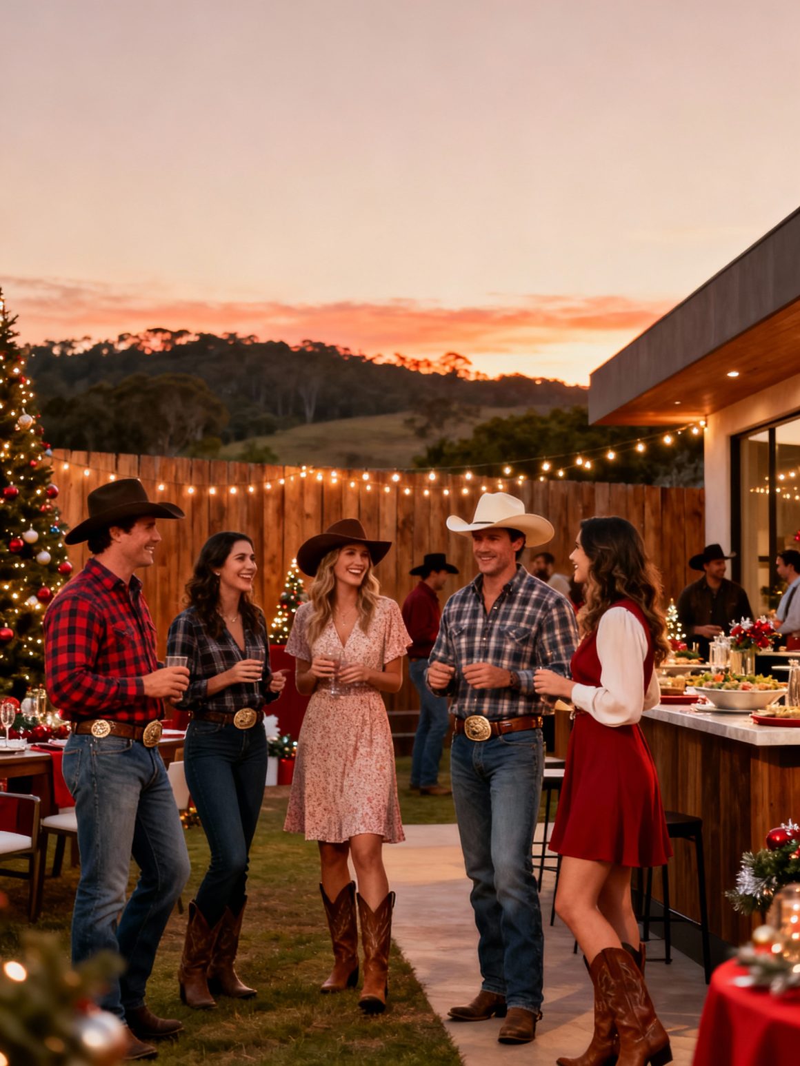 Nas comemorações de Natal, tons como vermelho, verde, off-white e marrom se integram muito bem ao estilo country. Já no Ano Novo, o branco continua em alta, mas ganha um toque western com botas, cintos, detalhes em couro, franjas e metais. Peças em jeans, couro, camurça e algodão deixam o visual autêntico e resistente, ideal para quem dança, caminha e aproveita a festa até o fim.
